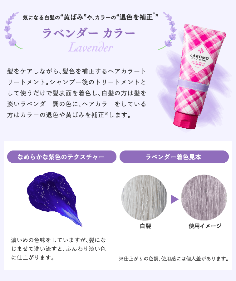 グレイヘアを楽しむ方におすすめ!人気の白髪染め※1ヘアカラートリートメントに白髪の黄ばみをおさえ、やわらかな透明感をプラスする「ラベンダーカラー」がついに登場!繰り返し使うことで、白髪を活かした上品な「ふんわりラベンダーヘア」もお楽しみいただけます。また、ヘアカラーをされている方は、カラーの退色や黄ばみを補正※2し、ツヤのある落ち着いた髪色へ導きます。