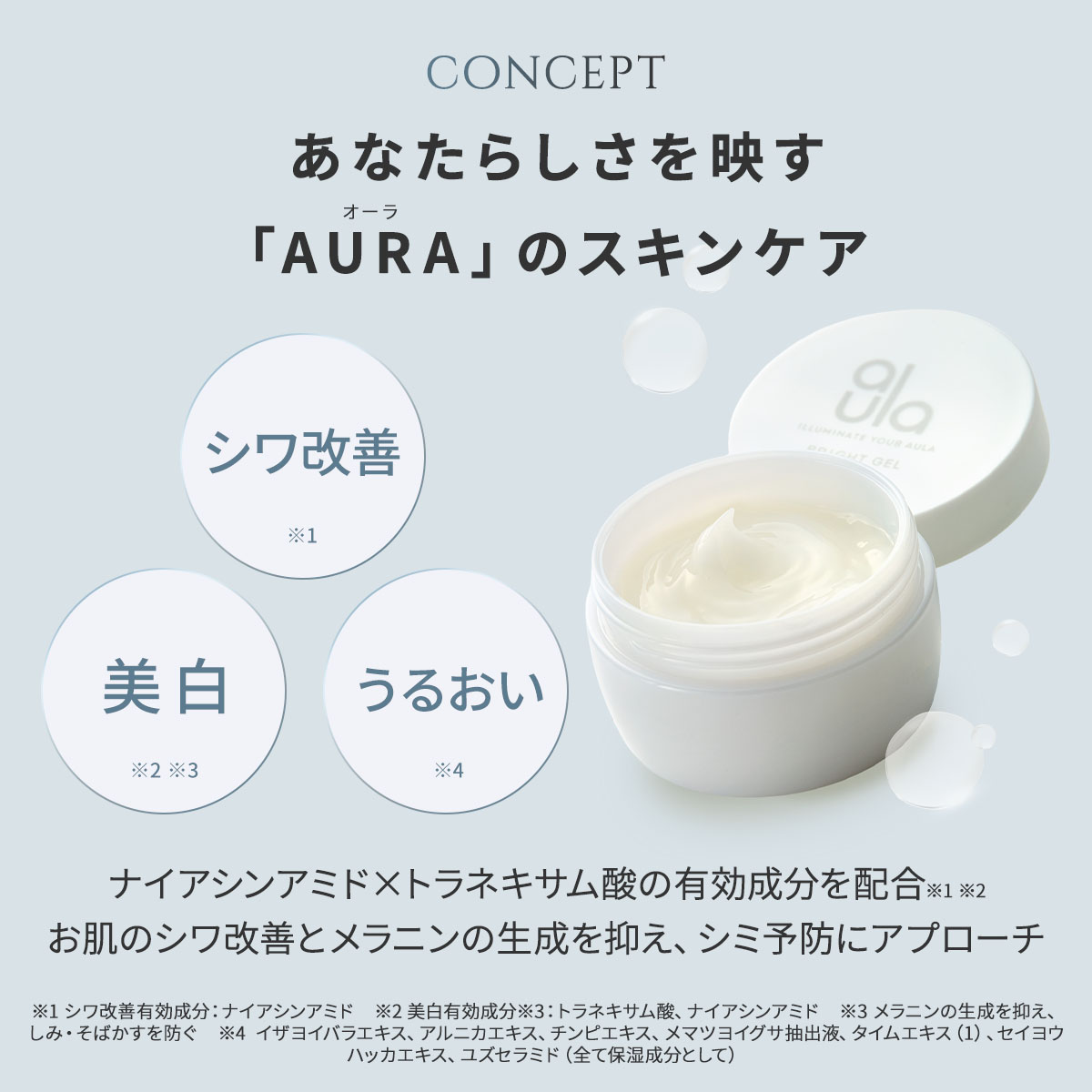 「AULA(オーラ) ブライトジェル」は、有効成分※1を配合した医薬部外品の薬用ジェルです。