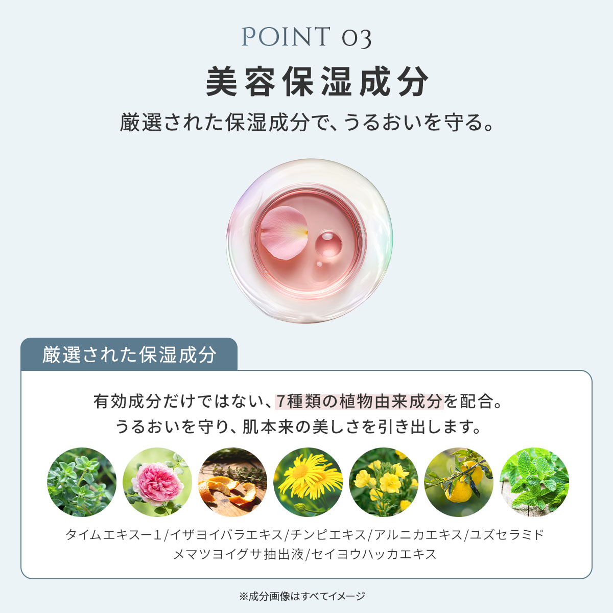 ※3 タイムエキスー1、イザヨイバラエキス、チンピエキス、アルニカエキス、ユズセラミド、メマツヨイグサ抽出液、セイヨウハッカエキス(全て保湿成分として)