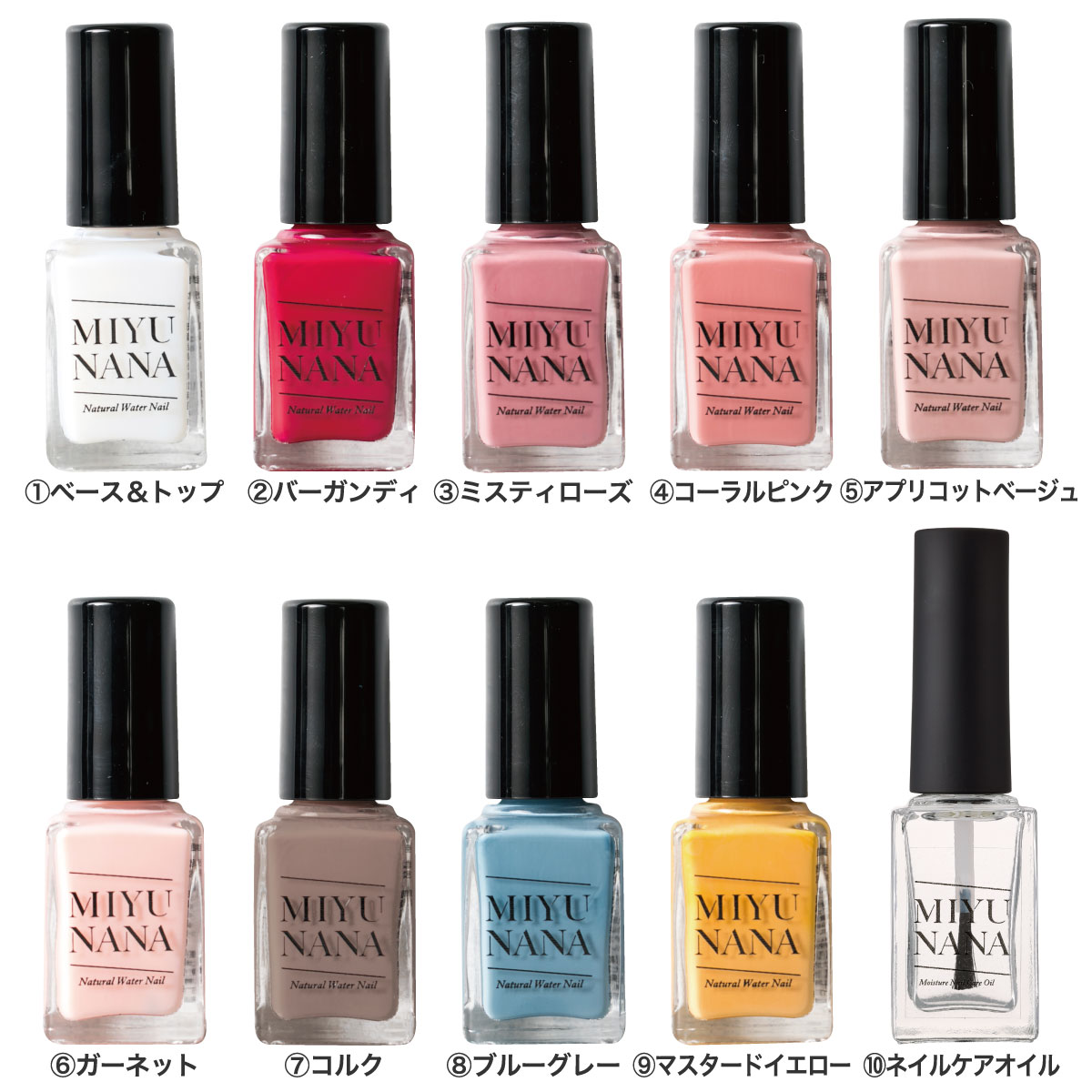 除光液のいらない水性ネイル(マニキュア)「MIYUNANA ーミユナナー」。主成分は「水(安定剤)」と「ホタテ(消臭剤)成分」。有機溶剤を使っていないので、落とす時に除光液が必要ありません。お湯で簡単にオフできます。速乾性で無臭の水性ネイルで、空間や時間を気にせず気軽に楽しめます。その日につけたネイルはその日のうちに落とす「ワンデイネイル」。服を着替えるようにネイルを選ぶのが楽しい9色のバリエーションをご用意しています。