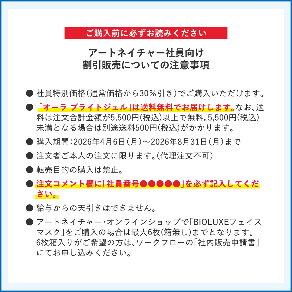 ページをご覧いただき誠にありがとうございます。こちらはアートネイチャー社員割引の専用ページです。注意事項をご確認の上、ご利用ください。