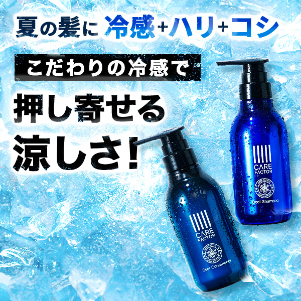 CARE FACTOR(ケアファクター) クールシャンプー(男性用(メンズ)・トニックシャンプー)のページです。メンズ(男性)向けのメントール入りのトニックシャンプー。梅雨や夏などのスッキリしたいときにおすすめです!刺激的な冷感とさっぱりとした洗いあがりの相乗効果に加え、しっとり仕上がる冷感シャンプーです。夏の気になるニオイもケアします。増毛・白髪のためのヘアケア商品ならアートネイチャー・オンラインショップにお任せください。薄毛・抜け毛・白髪など髪にお悩みの方に、男性用から女性用までアートネイチャーが最新の増毛・育毛アイテムをお届けいたします。