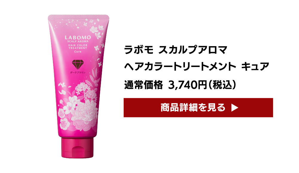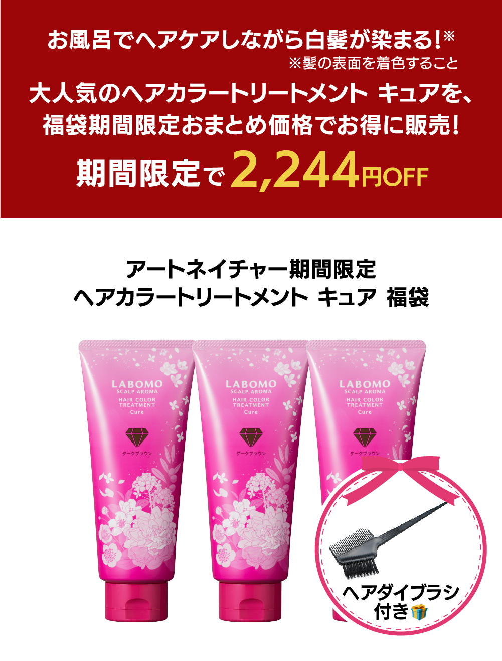 LABOMO(ラボモ) スカルプアロマ ヘアカラートリートメント キュア【白髪染め/黒(ブラック)・茶色(ブラウン)系】のページです。増毛・白髪のためのヘアケア商品ならアートネイチャー・オンラインショップにお任せください。薄毛・抜け毛・白髪など髪にお悩みの方に、男性用から女性用までアートネイチャーが最新の増毛・育毛アイテムをお届けいたします。