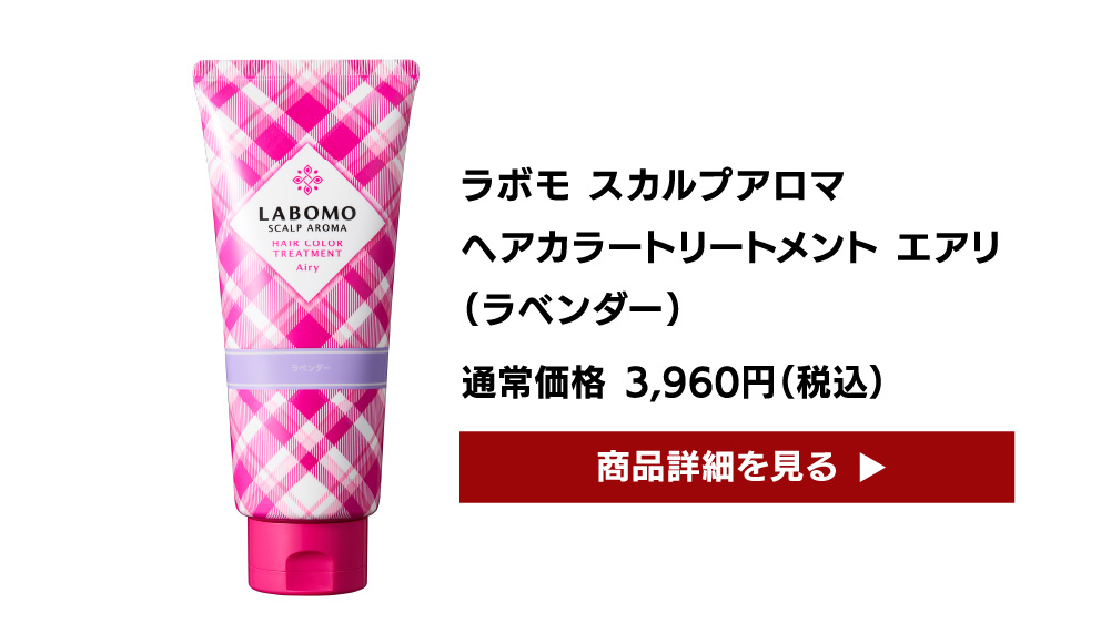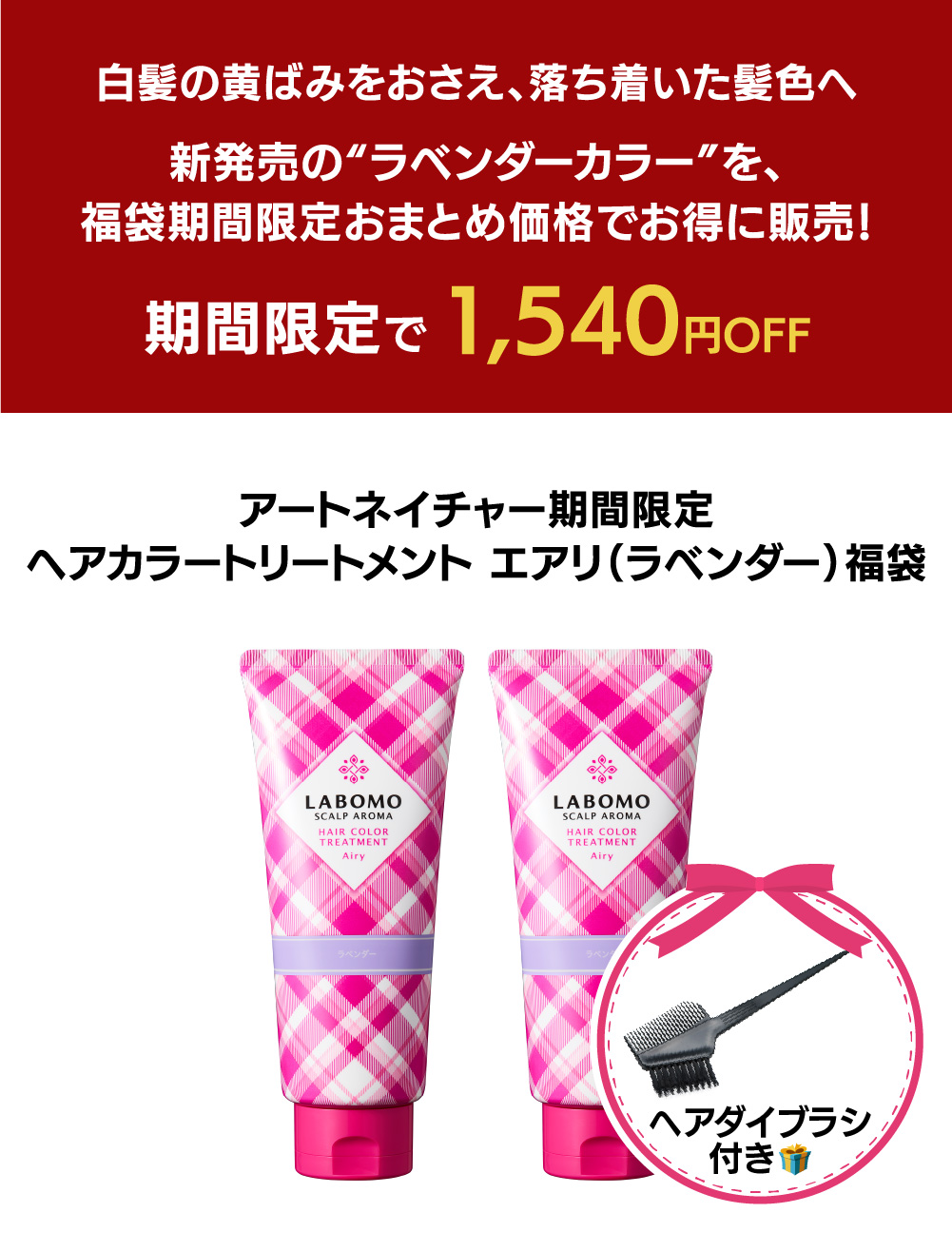 【白髪染めトリートメント】ラボモ スカルプアロマ ヘアカラートリートメント エアリ(ラベンダー)のページです。増毛・白髪のためのヘアケア商品ならアートネイチャー・オンラインショップにお任せください。薄毛・抜け毛・白髪など髪にお悩みの方に、男性用から女性用までアートネイチャーが最新の増毛・育毛アイテムをお届けいたします。