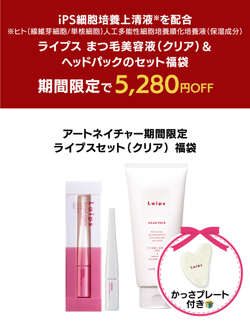 iPS細胞の培養上清液を配合したまつ毛美容液「Laips アイラッシュアンプル(クリア)」と、トリートメント「Laips ヘッドパック」のセットページです。増毛・白髪のためのヘアケア商品ならアートネイチャー・オンラインショップにお任せください。薄毛・抜け毛・白髪など髪にお悩みの方に、男性用から女性用までアートネイチャーが最新の増毛・育毛アイテムをお届けいたします。