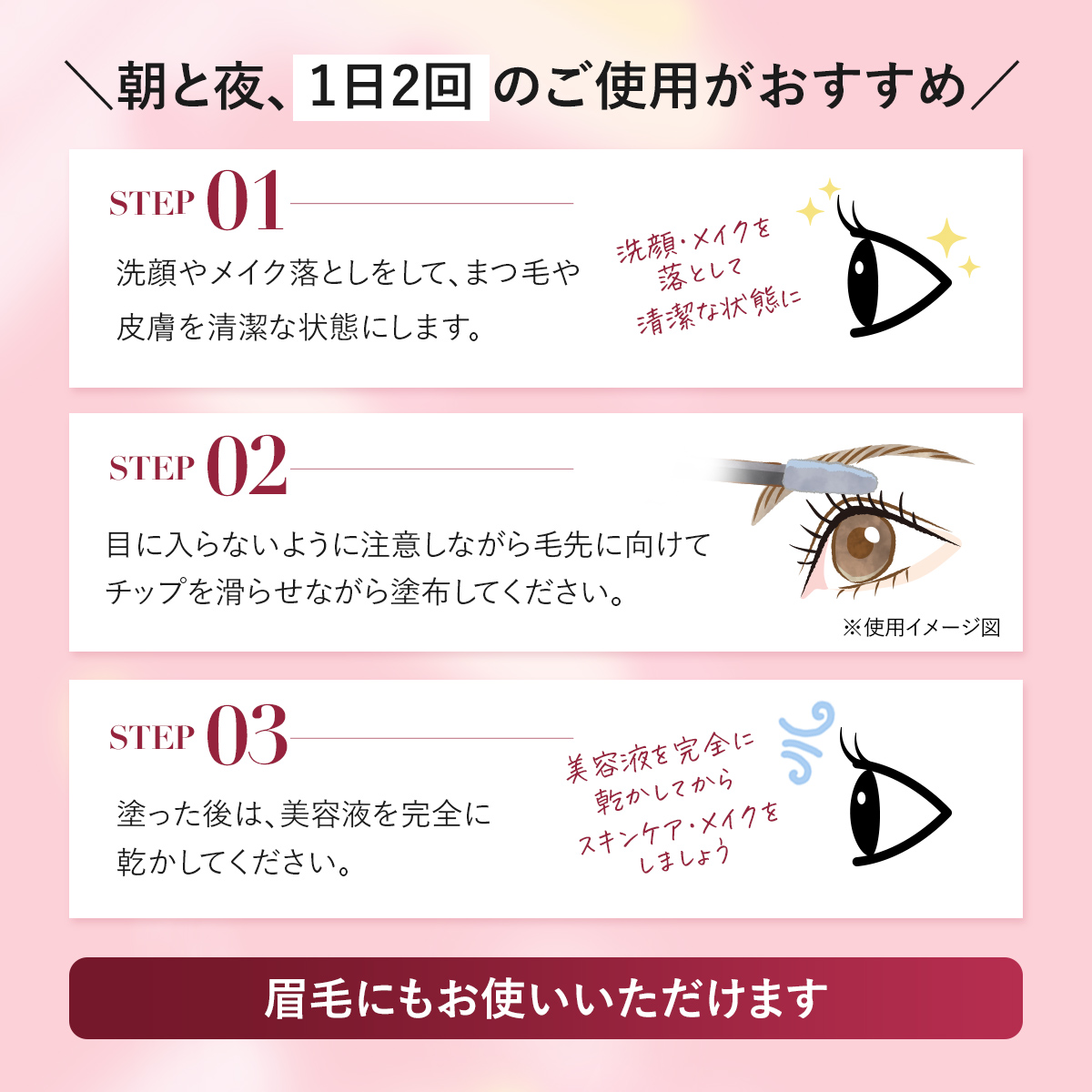 ●洗顔後、スキンケア前の清潔な状態でご使用ください。 ●目に入らないよう注意しながら、毛先に向けてチップを滑らせ塗布してください。 ●マスカラ下地としてお使いの場合は、液が完全に乾いてからマスカラをご使用ください。
