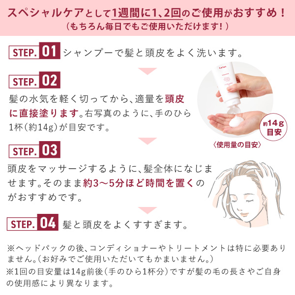 洗髪後、適量を手にとり、頭皮をマッサージするように髪全体になじませてからすすぎます。