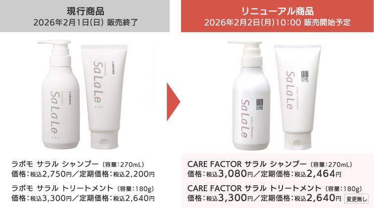 この度、「ラボモ サラルシリーズ」を2026年2月2日(月)よりリニューアルする運びとなりましたので、ご案内申し上げます。なお、商品リニューアルに伴い、一部商品の価格が変更となっております。詳細につきましては、下記をご確認くださいますようお願いいたします。